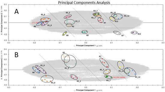 Principal component analysis (PCA) for all the molecules including (A; >11,000 compounds) or without (B; >2400 molecules) the Mv Béres genotype in ESI-mode. (R: Rht-B1a R1: Rht-B1b R3: Rht-B1c; B: Mv Béres; 0, 2, 7 and 12 days of hardening at 5 °C).