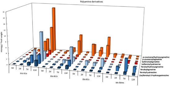 Polyamine derivatives in control (0 d) and cold-hardened young ‘April Bearded’ NILs and Mv Béres wheat genotypes (after the 2, 7 or 12 days of hardening at 5 °C).