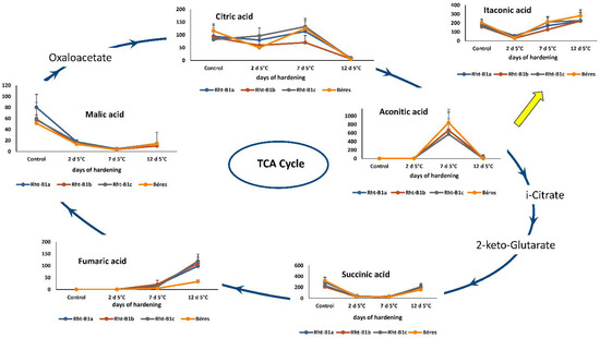Changes in the components of the Tricarboxylic Acid (TCA) Cycle and certain related compounds during the 12-days of cold hardening period in ‘April Bearded’ NILs and the wheat variety Mv Béres.