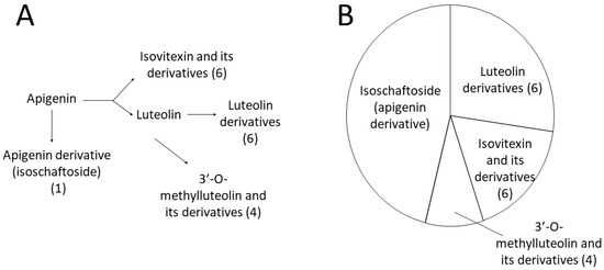 Biosynthetic relationships of the 17 differentiating flavones (A) and their contribution to the total flavone response (B), based on their summed abundance. (1), (4) and (6) are the numbers of the flavones and their derivatives. Names and detailed information can be found in Table 1.