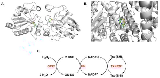 Selenium is required to ensure the expression and functionality of selenoproteins to protect cells from oxidative damage. (A) Structure of selenoenzyme glutathione peroxidase GPX1 in Bos taurus (Bovine), which plays an essential role in detoxifying hydrogen peroxide (PDB: 1GP1). Selenium is a crucial intracellular part of this enzyme’s ability to protect cells. (B) Crystal structure of recombinant rat thioredoxin reductase TXNRD1 with oxidized C-terminal tail depicting the selenocysteine residue that is key for its catalytic activity (PDB: 3EAO). The functionally important selenocysteine residue present in the active site of (A,B) is highlighted in color. (C) Scavenging of ROS by GPX1 and catalytic redox cycle of selenoprotein thioredoxin (Trx) by Trx reductase TXNRD1. GR, glutathione reductase; GSH, glutathione (reduced form); GSSG, glutathione disulfide.