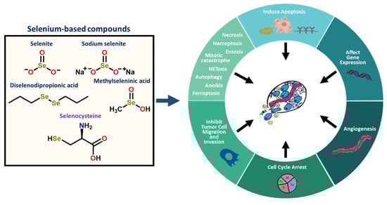 Multiple reports have shown that selenium in varying forms (e.g., organic, inorganic, or as selenoproteins) can exert anticarcinogenic or antimutagenic properties that allow them to serve as promising candidates for anticancer therapies (Figure 2 and Figure 3) [,,]. It has been reported that Se possesses anti-proliferative, anti-inflammatory, and anti-viral activities in addition to immune altering properties and has been implicated in various cancers [,]. Inorganic selenium-based compounds (such as selenite and selenate) tend to metabolize into hydrogen selenide and organic forms of selenium (such as diselenides, selenides, selenoesters, methylseleninic acid (MSA), 1,2-benzisoselenazole-3[2H]-one and selenophene-based derivatives, and selenoamino acids and Selol) metabolize into methylselenol [,]. These highly reactive, redox-active metabolites (e.g., hydrogen selenide or methylselenol) exhibit distinct cellular functions and toxicities that give rise to their chemopreventive or chemotherapeutic properties [,,].