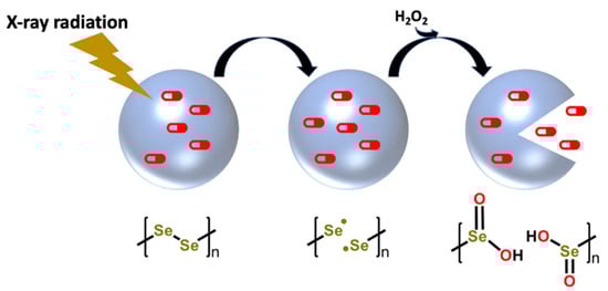 Zhang et al. [] designed a drug delivery system in which diselenide block copolymers act as a nanocarrier to release the desired cancer treatment upon receiving a radiation dose of 2 gray (Gy) (Figure 6). The diselenium-derived polymer that makes up the nanocarrier (Figure 6) interacts with the X-ray dose and the high amounts of ROS commonly present in the tumor microenvironment to break apart and release anticancer agents [,,,,]. Mechanistic insights were gained by nuclear magnetic resonance and density functional theory studies and suggest that the diselenium bond of the block copolymers is homolytically cleaved in the presence of X-ray radiation to produce selenyl radical species []. The high amounts of ROS (e.g., H2O2) present in various types of cancers results in its oxidization to a selenium-derived acid product and the release of enclosed chemotherapeutics []. Studies with 4T1 breast cancer tumor-bearing mouse models successfully demonstrated the delivery of anticancer agents in these diselenide X-ray-responsive nanocarriers to the tumor site with efficacious effects (reduced tumor volume/weight) and no additional toxicity []. The further development of diselenide nanocarrier drug-delivery systems may allow for a promising avenue leading to the reduction of the negative side effects of conventional cancer therapy that improve or at least do not compromise its efficacy []. Recently, an amorphous form of Selenium nanoparticles (α-Se NPs) synthesized using electron beam and stabilized within room-temperature ionic liquids (RTILs) as a host matrix provided great control over the size of the nanoparticles. In addition, the in vitro findings demonstrated that α-Se NPs exhibited the selective killing of A549 lung cancer cells over normal INT407 control cells []. Similarly, Wan et al., synthesized a porphyrin-containing covalent organic framework (COF) as a substrate for accommodating Se NPs, thus preventing the aggregation of Se NPs and enhance the stability. The combination of Se NP-mediated therapy with photodynamic therapy (PDT) greatly achieved long-acting and effective anticancer effects []. So, the futuristic studies exploring Se-based therapy alone or in conjunction with other therapeutics for the effective treatment of cancers are highly encouraged. Multiple reports have demonstrated the therapeutic potential of selenium nanoparticles in a wide range of biological processes and the exploitation of these properties may improve treatments for various diseases [,,,,,,,].