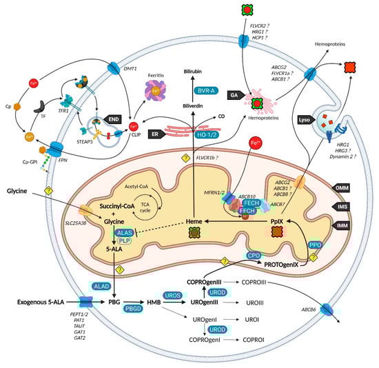 Current vision of the major players of heme metabolism and their interactions. Endoplasmic Reticulum (ER), Golgi Apparatus (GA), Outer/Inner Mitochondrial Membrane (OMM/IMM), Inner Mitochondrial Space (IMS), Endosome (END), and Lysosome (Lyso). Porphobilinogen (PBG), Hydroxymethylbilane (HMB), Uroporphyrinogen (UROgen), Coproporphyrinogen (COPROgen), and Protoporphyrinogen (PROTOgenIX). For other acronyms, please refer to the table at the end.