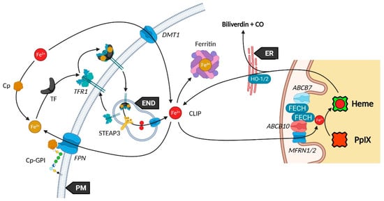 Iron availability (see Figure 2) is tightly controlled by diverse mechanisms in cells that have been comprehensively reviewed [,,]. Such control is mandatory to prevent Fe2+ accumulation that leads, through the Fenton reaction, to toxic hydroxyl radical production. Elementarily, ferrous iron (Fe2+) from the extracellular matrix binds to the transferrin (TF) carrier as ferric iron (Fe3+). Transferrin subsequently links to the plasma membrane transferrin receptor 1 (TFR1), forming a complex that will be endocytosed. Endosomal reduction of Fe3+ is handled by STEAP3, the six-transmembrane epithelial antigen of prostate 3 followed by translocation of free Fe2+ into the cytosol by the divalent metal transporter 1 (DMT1). DMT1 was also found to mediate Fe2+ intracellular level by acting as a plasma membrane importer. Similar to the Fe-TF-TFR1 complex, Fe-DMT1 can be internalized in endosomes and act on the cytosolic labile iron pool (CLIP) or deliver Fe to mitochondria. Additionally, DMT1 was found to be expressed in the outer mitochondrial membrane (OMM) and to act as both a mitochondrial iron importer and exporter []. A more direct use of the CLIP might take place throughout a “kiss and run” process that may operate by the sole touch of the endosome with the mitochondrion. The CLIP excess is controlled by the iron efflux protein ferroportin (FPN) that dispatches Fe2+ back in the cytoplasm, as well as by the iron storing complex ferritin []. Iron from the cytosolic pool may be incorporated in mitochondria through the MFRN1-ABCB10 complex, as mentioned above, in order to act as a substrate of PpIX.
