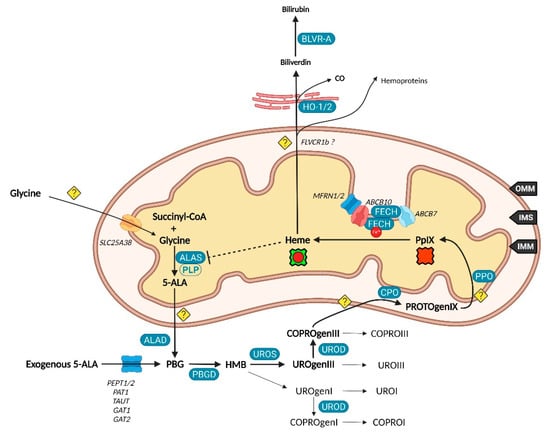 It was recently discovered that, in order to produce 5-ALA, cells import glycine through the mitochondrial glycine transporter localized at the inner mitochondrial membrane (IMM) and encoded by the SLC25A38 solute carrier gene []. The newly synthetized 5-ALA then moves out of the mitochondrion by a still obscure way. Previous studies suggested that SLC25A38 facilitates the exchange of glycine and 5-ALA through the mitochondrial membrane [] and that the ATP-binding cassette subfamily B member 10 (ABCB10) is essential for 5-ALA export to the cytoplasm []. In contrast, it was more recently shown that silencing of ABCB10 in zebrafish and murine Friend erythroleukemia cells did not reduce the 5-ALA cytoplasmic concentration and thus rejected a direct interaction of ABCB10 with 5-ALA to export the latter [].