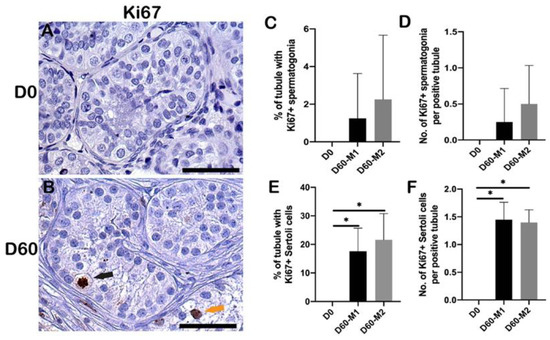 Proliferation of spermatogonia and Sertoli cells. Ki67 positive staining in spermatogonia and Sertoli cells within ITT at D0 (A) and D60 (B). Black arrow: Ki67-positive spermatogonium; orange arrow: Ki67-positive Sertoli cells. Scale bar = 50 μm. (C) Percentage of tubules with proliferating spermatogonia (positive tubule). (D) The number of proliferating spermatogonia per positive tubule. (E) Percentage of tubules with proliferating Sertoli cells (positive tubule). (F) The number of proliferating Sertoli cells per positive tubule. Asterisks indicated statistically significant differences.