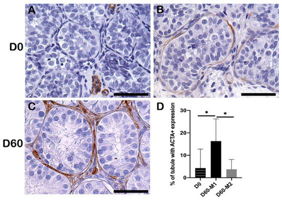 Alpha-smooth muscle actin (α-SMA, also named ACTA)-positive peritubular myoid cells (PTMCs) developed during the 60-day culture (Figure 5A–C). At D0, ACTA-positive PTMCs were only observed in a testicular biopsy from one patient (Patient #1), but at D60, they were shown in testicular biopsies from three patients (Patient #1, #2, #3). A significantly higher percentage of tubules with ACTA-positive PTMCs was observed at D60 in M1 compared to D0 (p = 0.02) (Figure 5D). More tubules expressed ACTA-positive PTMCs after culture in M1 than in M2 (p = 0.02) (Figure 5D).