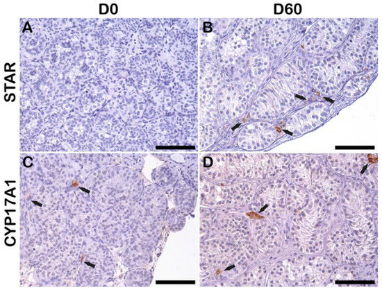 Leydig cell functionality. IHC staining of Leydig cells for STAR at D0 (A) and D60 (B), CYP17A1 at D0 (C), and D60 (D). Scale bar = 100 μm. The black arrow indicated positive expressions.
