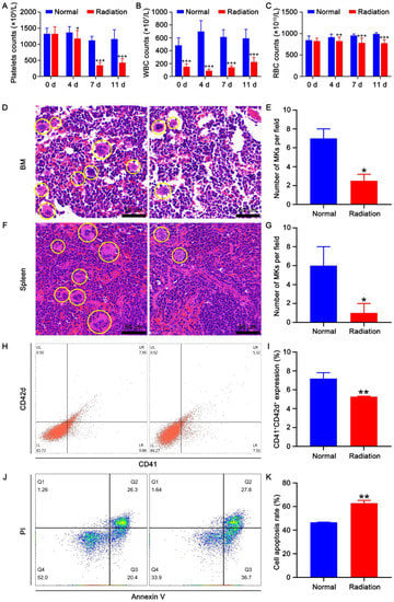 Effect of irradiation on hematopoiesis. Peripheral platelet (A), WBC (B), and RBC (C) counts in mice at different time points after irradiation. Thirty-two mice divided into two groups (eight males and eight females in each group) were used. Data represent the mean ± SD of three independent experiments. * p < 0.05, ** p < 0.01, *** p < 0.001 vs. the normal group. H&E staining of BM (D) and spleen (F) in normal and irradiated mice. The histograms represent the number of megakaryocytes in the BM (E) and spleen (G) of normal and irradiated mice. Data represent the mean ± SD of three independent experiments. * p < 0.05 vs. the normal group. (H) Flow cytometry analysis of the expression of CD41 and CD42d in the BM cells of normal and irradiated mice. (I) The histogram illustrating the proportion of CD41 + CD42d + cells in each group. Data represent the mean ± SD of three independent experiments. ** p < 0.01 vs. the normal group. (J) Apoptosis analysis of the BM cells of normal and irradiated mice. (K) The histogram depicting the apoptosis rate of BM cells in each group. Data represent the mean ± SD of three independent experiments. ** p < 0.01 vs. the normal group.