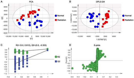 Radiation-induced metabolomics phenotypes of mice in the ESI+ model. PCA score plot (A) and OPLS-DA score plot (B) for serum metabolic profiling of normal and irradiated mice, permutation validation (n = 100) (C), and S-plots (D) between normal and irradiated mice. * ESI+: Electrospray ionization source in positive-ion mode.