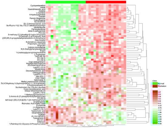 A principal component analysis (PCA) was used for the initial grouping of normal and irradiated mice to derive more intuitive and visual results of the sample analysis. The sample distribution areas of the normal and model groups were basically separated, and all samples fell within the 95% confidence interval, which indicates that the serum metabolites were significantly changed in irradiated mice (Figure 2A). Furthermore, the use of OPLS-DA can better reflect the differences in serum metabolites between normal and irradiated mice, maximizing the separation and mining different metabolites. As shown in Figure 2B, the OPLS-DA score scatter plots showed that the samples of model mice and normal mice were completely separated and fell into different regions, indicating that the metabolism of the model group was different from that of the normal group. The R2Y value of OPLS-DA models for LC-MS (ESI+) was 0.856 and the Q2 value was 0.751, the fitness and predictive ability of the model were evaluated using R2 and Q2, and 100 permutation tests were performed on R2 and Q2 as shown in Figure 2C, which suggests good fitness and predictive ability of the model. Finally, the loading S-plot was initially screened for metabolite ions that differed significantly between normal and irradiated mice (Figure 2D). Thus, the results of the multivariate statistical analysis showed significant differences in the serum metabolic profiles between normal and irradiated mice, indicating that specific metabolites were altered in mice after radiation exposure.