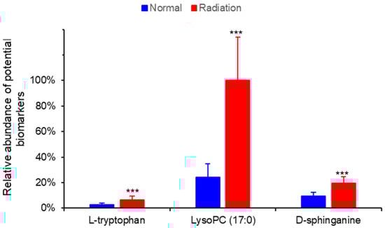 Relative abundance of three potential biomarkers in normal and irradiated mice. Data represent mean ± SD, *** p < 0.001 vs. normal mice.