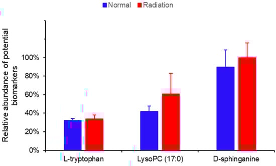Relative abundance of three potential biomarkers in the extract ion chromatogram of normal and irradiated mice. Data represent mean ± SD.