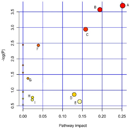 Pathway analysis of radiation-induced thrombocytopenia. Glycerophospholipid metabolism (A), nicotinate and nicotinamide metabolism (B), sphingolipid metabolism (C), inositol phosphate metabolism (D), tryptophan metabolism (E), Phosphatidylinositol signaling system (F), Glycerolipid metabolism (G), Glycine, serine, and threonine metabolism (H), and Arginine and proline metabolism (I).