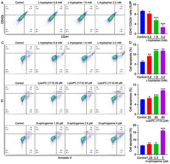 Effects of metabolites on the differentiation and apoptosis of K562 cells. (A) Flow cytometry analysis of the expression of CD41 and CD42b after the treatment of K562 cells with different concentrations (0.8, 1.6, and 3.2 mM) of L-tryptophan for 6 days. (B) The histogram represents the proportion of CD41 + CD42b + cells in the control and L-tryptophan-treated groups. Data represent the mean ± SD of three independent experiments. *** p < 0.001 vs. the control group. (C) Apoptosis analysis of K562 cells treated with different concentrations of L-tryptophan (0.8, 1.6, and 3.2 mM), LysoPC (17:0) (20, 40, and 80 μM), and D-sphinganine (1.25, 2.5 and 5 μM) for 6 days. (D) The histogram represents the apoptosis rate of each group. Data represent the mean ± SD of three independent experiments. * p < 0.05, ** p < 0.01, *** p < 0.001 vs. the control group.