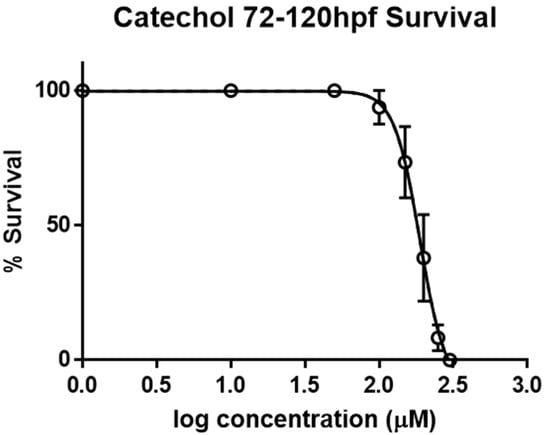 Determination of LC50 values for catechol exposure against 72–120 hpf zebrafish larvae. In total, 72 hpf zebrafish embryos were exposed to catechol in HEPES buffered E3 (HE3) containing 0.5% DMSO for 48 h. Percent survival is calculated as 100-(number of dead embryos/number of total embryos × 100) and then plotted as four-parameter variable slope curve.
