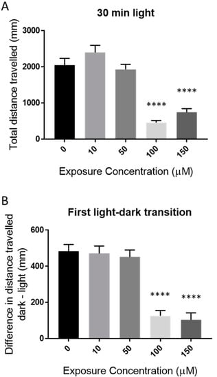 Catechol exposure resulted in decreased locomotor activity during the initial baseline of 30 min of the behavioral protocol at 100 µM and 150 µM (Figure 2A). There was a similar decrease in the first light–dark transition (startle response) (Figure 2B).