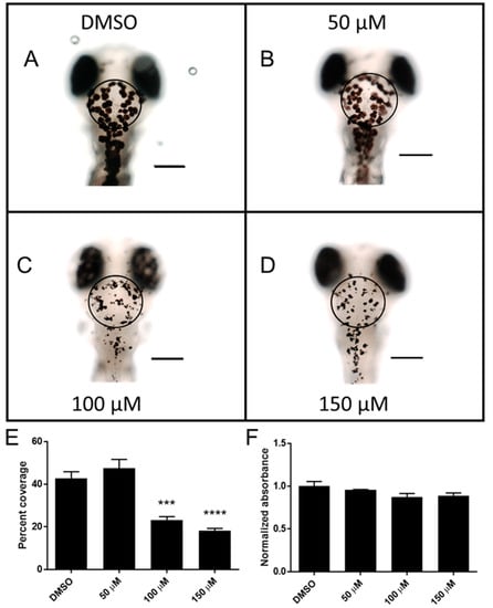 Phenotypic changes due to catechol treatment. In total, 72 hpf larvae were exposed to increasing concentrations of catechol for 48 h under dark conditions prior to fixation. Representative images of each treatment are shown in panels (A–D) ((A)—DMSO, (B)—50 µM, (C)—100 µM, (D)—150 µM). The areas used to calculate percent coverage are shown (circles), scale bars—0.2 mm. Percent coverage of melanocyte compared to total area was calculated for 10–14 embryos and is shown in panel (E). Melanin quantification was also performed on similarly treated, unfixed embryos (panel (F)). *** p < 0.001, **** p < 0.0001 compared to DMSO, one-way ANOVA, Bonferroni’s post hoc test.