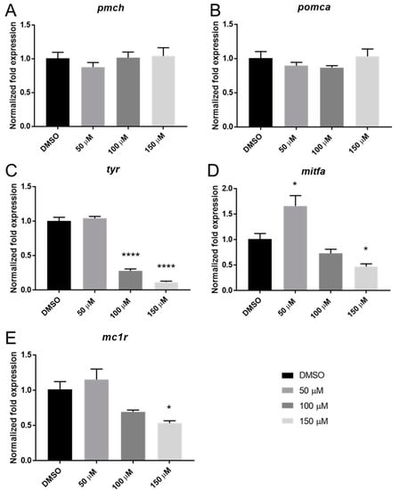 To investigate the mechanism of the catechol-based pigmentation effects, the expression of several melanocyte-related genes was measured (Figure 4). tyr expression (Figure 4C) was decreased at both 100 µM and 150 µM (p < 0.0001). At 150 µM, catechol induced a significant decrease in the expression of the pigment-related genes mitfa (p < 0.05) and mc1r (p < 0.05) (Figure 4D,E respectively). Interestingly, 50 µM catechol caused a significant increase in mitfa expression (Figure 4D).