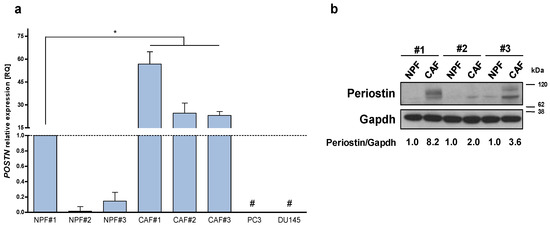 Periostin is over-expressed in CAFs. (a) Expression levels of POSTN mRNA were assessed by qRT-PCR in a panel of three patient-derived CAFs isolated from the tumoral area of radical prostatectomy samples and matched normal prostate fibroblasts (NPFs) isolated from non-tumoral areas and PCa cell lines (DU145, PC3). Data represented as mean ± SD of three independent experiments with respect to NPF#1 (Mann–Whitney one-sided test, * = p < 0.05). # = undetected values. Ct value of POSTN in NPF#1 is 27. (b) Western blotting analysis showing periostin protein levels in three paired CAFs and NPFs. Quantification, as indicated under the blot, was estimated from the intensity of Western blot signals using the ImageJ software. The periostin/gapdh ratios were relativized to 1 for each paired sample.