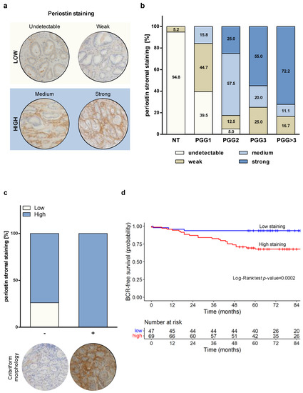 The periostin staining score was evaluated by an expert uropathologist (M.C.). M.C. set up a scale ranging from 0 to 3, where 0 represents ‘undetectable staining’, 1 ‘weak staining’, 2 ‘medium staining’, and 3 the highest (strong) stromal staining observed in the tissue sections.