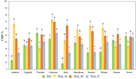 When CMS was measured after pre-treatment of 2 h at 40 °C (ThA_40, Figure 1), a group of five cvs, Ardente, Cappelli, Meridiano, Svevo, and Ofanto, showed values below 50% (45.10%, 45.52%, 48.31%, 48.34%, 49.21% respectively); the other group of cvs, i.e., Claudio, Neodur, and Simeto, had CMS values between 50 and 60% (51.15%, 55.97%, 51.64% respectively); the highest values (over 60%) were observed in Kofa and Colosseo cvs (64.54% and 68.89%, respectively). Moreover, Cappelli, Kofa, and Simeto cvs reached CMS values significantly higher than in all the other treatments (Table S2). The CMS values reached by Ardente, Meridiano, Neodur, and Ofanto were significantly lower with respect to those obtained after the pre-treatment at 34 °C for 24 h (ThA_34).