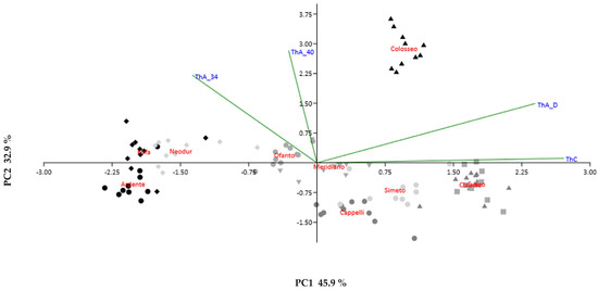Principal component analysis (PCA) biplot of CMS measured in the ten T. durum cvs grown under the different stress treatments. The percentage of total variance as explained by each axis is shown, sample differentiation pattern is mostly influenced by constitutive thermotolerance (ThC) along PC1 and by acquired thermotolerance (ThA) along PC2. ThC, constitutive thermotolerance; ThA_34, acquired thermotolerance after a treatment at 34 °C for 24 h; ThA_40, acquired thermotolerance after heat shock at 40 °C for 2 h; ThA_D, acquired thermotolerance after drought stress for 2 h.