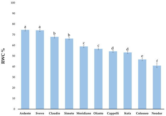 Relative water content (RWC) measured in seedlings of ten T. durum cvs in response to dehydration for 2 h. Different letters indicate a significant difference at p < 0.05 (Anova, Bonferroni-Holm’s post-hoc test).