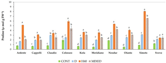 Free proline content measured in ten T. durum cvs in control conditions (CONT, green bar) and in response to drought stress (D, blue bar), to heat shock (H40, red bar), to mixed stress (MIXED, blue-red bar). The results are shown as the mean and standard deviation of the three replicates, expressed in μ mol g FW−1. For each cv, columns marked with different letters indicate significant difference among treatments at p < 0.05 (ANOVA with post-hoc Bonferroni-Holm test).