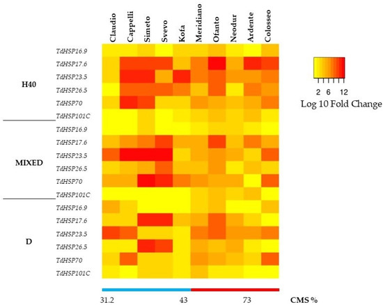 TdHSP17.6 TdHSP23.5, TdHSP26.5 and TdHSP70 showed high induction levels in response to all stresses, with decreasing values from H40, to MIXED and to D; overall these genes were the most stress-responsive in the cvs characterized by low level of acquired thermotolerance (CMS below 50%), which are Cappelli, Claudio, Kofa, Simeto, and Svevo. TdHSP16.9 was characterised by a low level of induction in all cvs as well as in all stress conditions.