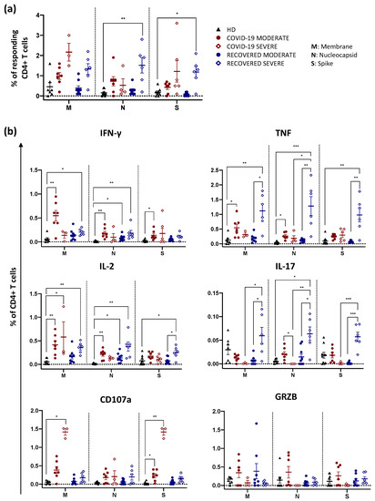 Individuals who recovered from a severe form of COVID-19 disease showed a higher percentage of CD4+ T cells responding to N and S compared to healthy donors (HD) (Figure 1a). Moreover, taking into consideration all the stimuli used, patients who recovered from a severe disease exhibited a higher percentage of CD4+ T cells producing IFN-γ, TNF and IL-2 compared to either HD or individuals who recovered from moderate disease (Figure 1b). This was also observed when COVID-19 patients with a moderate disease were compared to HD. Furthermore, recovered individuals who experienced a severe disease also displayed a higher percentage of CD4+ T cells producing IL-17 compared to recovered moderate, regardless of the stimulus used (Figure 1b). On the other hand, COVID-19 patients with severe infection were characterized by higher proportions of cells expressing CD107a compared to HD after M and S stimulation, indicating a more enhanced cytotoxic phenotype (Figure 1b).