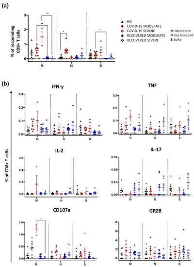 Regarding CD8+ T cell response, the percentage of CD8+ T cells responding to peptide pool stimulation was higher in COVID-19 patients with a moderate disease compared to either HD or recovered individuals who experienced a moderate infection. In addition, COVID-19 patients with severe form exhibited a higher percentage of responding CD8+ T cells compared to those who recovered from a severe form (Figure 2a). Furthermore, after in vitro stimulation with M, COVID-19 severe patients displayed a higher percentage of CD8+ T cells expressing CD107a compared to individuals who recovered from severe infection (Figure 2b). Thus, antigen-specific CD8+ T cells are more abundant among COVID-19 patients and present a more pronounced cytotoxic phenotype in line with their role in mediating clearance during viral infections [31].