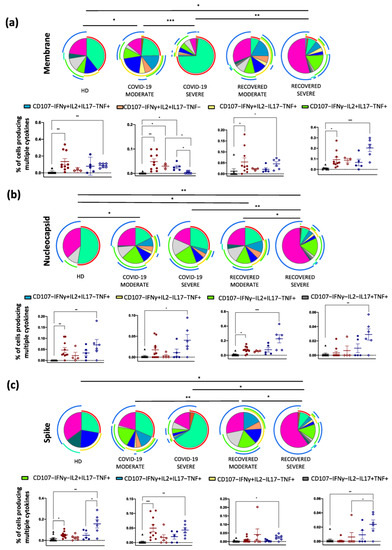 For these reasons, given the role and capability of these cells, the aim of the study is to characterize the polyfunctional profile of SARS-CoV-2-specific T cells. Moreover, we aimed to investigate possible differences in the specific response between patients experiencing and recovering from moderate or severe infection, deepening at the same time the immunogenic capacity of M, N and S SARS-CoV-2 structural proteins.