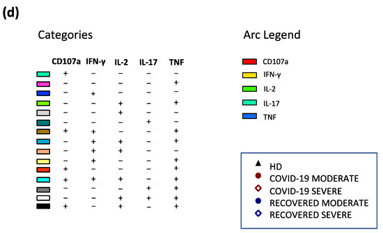 Finally, after stimulation with S, individuals who recovered from different disease severity showed a different polyfunctionality as well as COVID-19 moderate patients and recovered from the moderate disease. In addition, recovered from severe disease displayed a distinct polyfunctional asset compared to COVID-19 severe and HD. Individuals who recovered from severe disease presented almost overlapping results as those observed after stimulation with N and M. Moreover, they also displayed a higher percentage of TNF+IL-17+ within CD4+ T cells if compared to COVID-19 severe and HD. Regarding COVID-19 moderate, the cell distribution after stimulation is the same as the one measured after N stimulation (Figure 3c). For clarity, Figure 3d shows the legend of the colors and symbols of the previous Figure 3 panels.