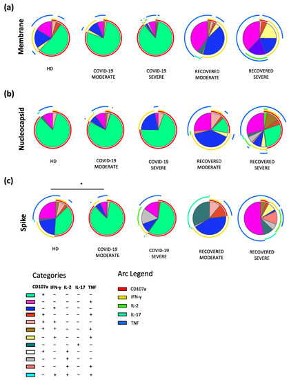 Polyfunctionality of CD8+ T cells after in vitro stimulation. Pie charts representing the proportion of CD8+ T cells producing different combinations of IFN- γ, TNF, IL-2, IL-17, GRZB as well as expressing CD107a after stimulation with (a) M; (b) N; or (c) S peptide pools from HD (n = 10), COVID-19 moderate (n = 7), COVID-19 severe (n = 6), recovered moderate (n = 9) and recovered severe (n = 6) patients. Data in pie charts are represented as median values. Frequencies were corrected by background subtraction as determined in non-stimulated controls using SPICE software. Statistical analysis between pie charts was performed using permutation test (* p < 0.05). Pie arches represent the total production of different cytokines.