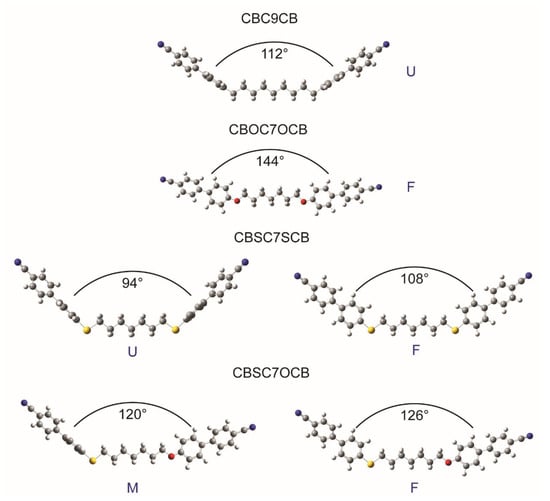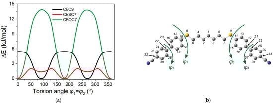 Figure 1 shows the calculated rotational potential barriers. First, the torsion angle of the cyanobiphenyl was calculated (φ3, φ4). The calculated value of the angle for the minimum energy was 40°, and the potential barriers to this twisted conformation were 8.71 kJ/mol for φ = 0° and 8.98 kJ/mol (for φ = 90°). The value of the φ1/φ2 angle is the most crucial for determining the bend angle of the molecule. There are a number of conformations for the CBSCnSCB and CBSCnOCB dimers, which are important for calculating the orientational order, primarily due to possible dihedral angle (φ1, φ2): CAl-S-CAr-CAr of the sulfur bridge for CBSCnSCB and also CAl-O-CAr-CAr (Ar—aromatic ring, Al—alkyl) of the oxygen bridge for CBSCnOCB. The conformational energies of the individual molecules were calculated with respect to those dihedral angles. Both angles were found to have a minimum energy for the “zero” angle (planar conformation) in contrast to the corresponding angle for CBCnCB: CAl-CAl-CAr-CAr, which was close to 90° with a potential barrier of 5.5 kJ/mol (upright conformation). The energy barrier to the rotation of the CAl-O-CAr-CAr bridge was high enough (∆U~13.7 kJ/mol) to enable only the planar conformer to be possible. In the case of the sulfur bridge (CAl-S-CAr-CAr), however, the barrier was much smaller (∆U~2.1 kJ/mol), and therefore, the intermolecular interactions might have influenced the molecular structure, which is in agreement with Y. Cao et al. []. This means that for the dimers that contain sulfur, more than one energetically stable conformation is possible. As the energy barrier to the internal rotation in the alkyl chain is very small (approx. 1 kJ/mol), no spacer other than the all-trans was considered. In the ordered phases, in principle, the alkyl chains can occupy all of the possible conformations, and, therefore, adopting all of the all-trans conformations is a better representation of the average molecular shape of the dimers [].
