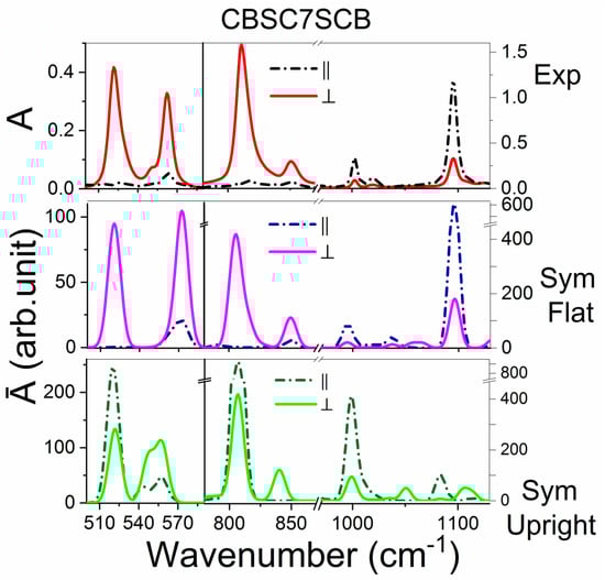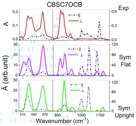 The most important information in comparing the conformers is polarity of the prominent bands. The simulated spectra correspond to the perfect order. On the contrary, the experimental spectra are measured in the nematic phase, and corresponding orientational order is rather weak (S~0.5) due to the bending shape of the molecules. In order to make them comparable, we converted experimental spectra to those of the perfect order (we used the Equation (2a,2b)) []. Then, we analyzed differences in the theoretical spectra between the two conformations (flat and upright), with comparison to the experimental spectra in the nematic phase.