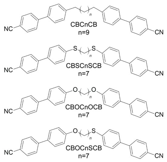 The symmetrical and asymmetrical liquid crystal dimers with the cyanobiphenyl (CB) mesogenic groups were investigated. We present three symmetric dimers, which had the general acronym CBXC7XCB (X = C or S or O), that contain nine functional groups in the chain linking the two mesogenic cores (methylene, thioether, ether); the CBC9CB that contains nine methylene groups in the linker and the CBSC7SCB and CBOC7OCB in which the alkyl chains contain seven methylene groups are connected to the cyanobiphenyls by two thioether or two ether bridges, respectively. In the asymmetric dimers with the acronym CBSCnOCB (n = 5, 7), the mesogens are linked to an alkyl chain with five or seven methylene groups on one side by a thioether bridge and on the other by an ether bridge. The details for the materials CBC9CB were reported earlier [,,]. Synthesis details concerning the thioether/ether compounds were published recently [,]. Figure 5 shows the chemical structures of the investigated compounds.