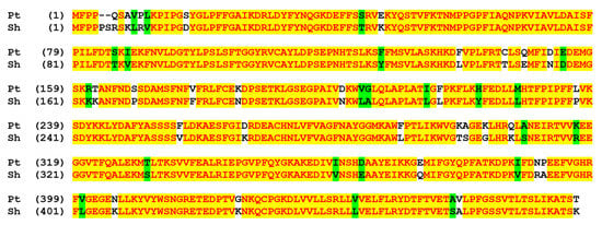 The pairwise alignment of CYP74C44 of S. hondurensis (Sh) vs. the putative CYP74C protein of poplar Populus trichocarpa (Pt). These two proteins share 88.7% sequence identity. The color scheme reflects the similarity of amino acid sequences.
