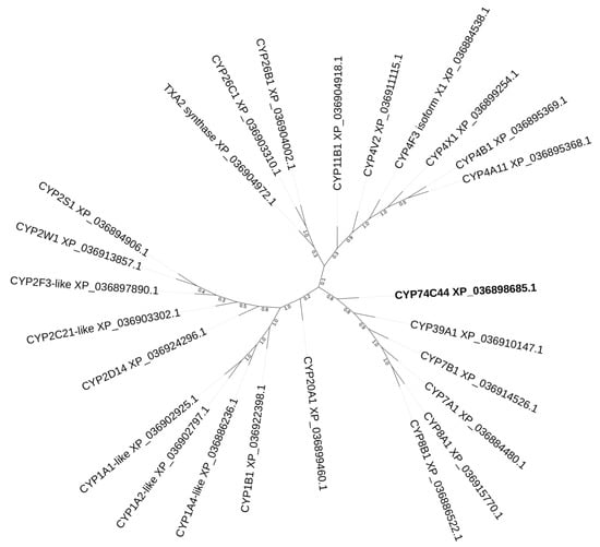 The phylogenetic tree of selected S. hondurensis P450s. CYP74C44 is highlighted in bold.