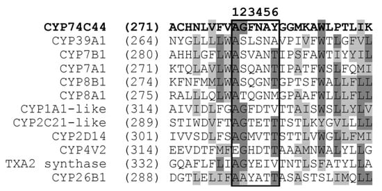 The construction of a phylogenetic tree of selected S. hondurensis P450s (Figure 2) revealed that CYP74C44 is built into a separate branch (Figure 2, left side of the tree), including also the putative prostacyclin PGI2 synthase CYP8A1 and several phylogenetically related proteins, namely CYP8B1, CYP7A1, CYP7B1, and CYP39A1. Another enzyme of prostaglandin endoperoxide metabolism, the putative thromboxane A2 synthase, is built into a separate branch (Figure 2, upper side of the tree) together with the CYP4 and CYP11 proteins. The protein BLAST analyses using CYP74C44 as a query vs. the S. hondurensis sequences (the partial multiple alignment of I-helix regions, SRS-4, is presented in Figure 3) showed poor homology. The I-helix groove motif of CYP74C44 possesses some alterations typical for CYP74 enzymes. Firstly, the D/E residue is conserved in monooxygenases such as CYP1A1, CYP2C21, and CYP4V2 (Figure 3, I-helix groove motif, position 4). In contrast, the Asp (N) residue at this position is conserved in all CYP74s, including CYP74C44. The putative PGI2 synthase (CYP8A1) has a Gly (G) residue at this position and an N residue at the next position (5).