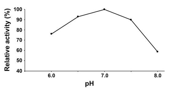The CYP74C44 coding sequence consisted of 1435 nucleotides and encoded a 478 amino acid polypeptide. This sequence was custom synthesized and cloned into the vector pET-23a (Novagen, Madison, WI, USA) to yield the target recombinant protein with a His-tag at the C-terminus. The His-tagged recombinant protein was obtained in BL21-CodonPlus-RIL host strain cells (Stratagene, San Diego, CA, USA) and purified by metal affinity chromatography. The enzymatic activity was controlled using ultraviolet spectroscopy by the decrease in fatty acid hydroperoxide absorbance at 234 nm. The pH optimum of the recombinant CYP74C44 was 7.0 (Figure 4).