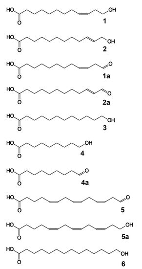 The structural formulae of major detected products and their derivatives: 1, (9Z)-12-hydroxy-9-dodecenoic acid; 1a, (9Z)-12-oxo-9-dodecenoic acid; 2, (10E)-12-hydroxy-10-dodecenoic acid; 3, 12-hydroxydodecanoic acid; 4, 9-hydroxynonanoic acid; 4a, 9-oxononanoic acid; 5, 14-hydroxy-5,8,11-tetradecatrienoic acid; 5a, (all-Z)-14-oxo-5,8,11-tetradecatrienoic acid; 6, 14-hydroxytetradecanoic acid.