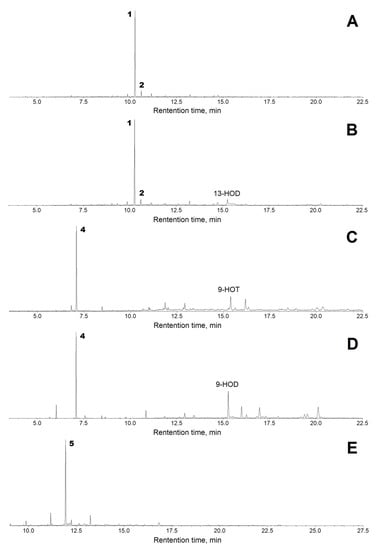 The total ion current GC–MS chromatograms of the products (Me/TMS) of incubation of 13-HPOT (A), 13-HPOD (B), 9-HPOT (C), 9-HPOD (D), and 15-HPEPE (E) with recombinant CYP74C44 of S. hondurensis. Conditions of incubation, extraction, derivatization, and analysis are described in Section 4. Abbreviations: 13-HOD, (9Z,11E,13S)-13-hydroxy-9,11-octadecadienoic acid; 9-HOT, (9S,10E,12Z,15Z)-9-hydroxy-10,12,15-octadecatrienoic acid; 9-HOD, (9S,10E,12Z)-9-hydroxy-10,12-octadecadienoic acid.
