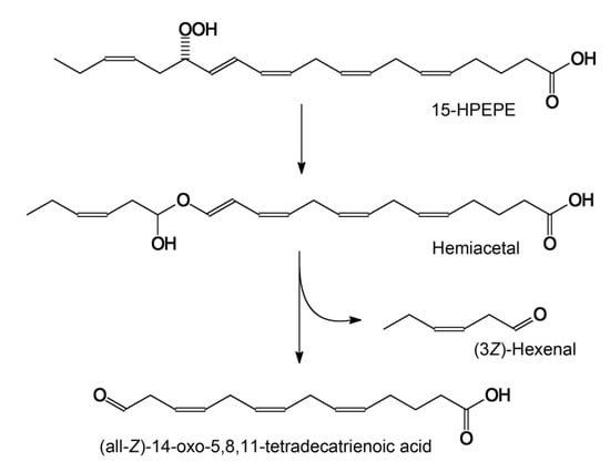 The SciFinder search revealed no mentions of (all-Z)-14-oxo-5,8,11-tetradecatrienoic acid as an HPL product in the literature. This compound has only been described as a product of chemical [33] or combined enzymatic–chemical [34] conversions of arachidonic acid. The loss of information on C14 aldoacid production by HPLs is not surprising since 15-HPEPE and 15-HPETE are not the physiological substrates for plant HPLs. The occurrence of HPL in the bat creates prerequisites for biosynthetic pathways from eicosapentaenoic or arachidonic acids to (all-Z)-14-oxo-5,8,11-tetradecatrienoic acid (see the mechanistic scheme in Figure 7). Moreover, 15-HPEPE is the preferred substrate for CYP74C44.