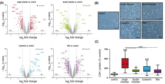 The observation that the endothelial cell proteome is most strongly altered by filtered fluid is consistent when taking into account the magnitude of differential regulation (Figure 1A). HUVEC exposed to PD fluids showed morphological changes and cell detachment to a different extent (Figure 1B). Lactate dehydrogenase (LDH) release increased to 362% (±24%) (p < 0.0001) compared with control after single-chamber fluid exposure and following exposure to double-chamber fluid (177% ± 10%, p = 0.029), and icodextrin (198% ± 18%, p < 0.0001). LDH did not significantly differ from control when cells were exposed to filtered fluid (156% ± 17%, p = 0.09). Exposure to single-chamber fluids significantly elevated the LDH release not only in comparison with control, but also to all of the other PD fluids (p < 0.001) (Figure 1C).