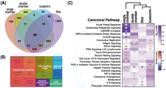 Common and differential effects of endothelial cells exposed to different PD fluids. (A) Venn diagram illustrating the overlap of significantly regulated (p < 0.01) proteins following PD fluid exposure. (B) Gene ontology (GO) cellular component analysis of the 49 proteins identified to be significantly regulated (Fisher’s exact test, p < 0.01 BH corrected) by all PD fluids. Only GO categories with log2 fold enrichment > 2 were further analyzed with the Revigo tool to summarize terms in a parental term, and the results are visualized as treemaps. (C) Heatmaps of significantly regulated canonical pathways (ingenuity pathway analysis, Fisher’s exact test p < 0.05) following PD fluid exposure compared with control medium. The p-value is visualized in violet by fill color intensity. Activation z-scores are indicated as up (activated; red) or down (deactivated; blue) colored arrows. The activation z-score is a calculated prediction of activation or inhibition of regulators based on relationships with dataset genes and direction of change of dataset genes. It represents the bias in gene regulation that predicts whether the upstream regulator exists in an activated or inactivated state. The direction of the arrow reflects the direction of the regulation (predicted activation: up, predicted inhibition: down).