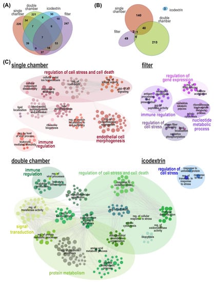 Enrichment maps of biological processes associated with proteins regulated exclusively by one kind of PD fluid. (A) Venn diagram illustrating the overlap of significantly regulated (LIMMA, BH p < 0.05, log2[fold change] > 0.5) proteins following PD fluid exposure. Only the proteins not overlapping were used for the biological process enrichment analysis. (B) Venn diagram illustrating the overlap of significantly enriched gene ontology biological processes analysis of each of the individual groups of proteins regulated by only one PD fluid. (C) Visualization of functionally grouped, significantly enriched (Fisher’s exact test p < 0.05) gene ontology (GO) terms of the non-overlapping significantly altered proteins by the individual PD fluids versus control. Network analysis of the enriched biological processes was performed with ClueGO in Cytoscape. Nodes were grouped according to their parent terms and connections. Node size represents term enrichment significance (smallest node: p < 0.05). Representative node labels are shown in each group, clustered in major biological processes. Non-connected terms were excluded from visualization.