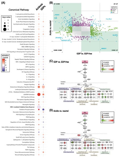 Effects of acidic pH or presence of glucose degradation products (GDPs) in PD fluids on endothelial cells. (A) Significant IPA canonical pathways (Fisher’s exact test p < 0.05) with an activation z-score ≠ 0; modeled acidosis effect: single-chamber, icodextrin, and filter versus double-chamber PD fluid; modeled GDPs effect: single-chamber, double-chamber, and icodextrin versus filter PD fluid; size of the nodes indicates the p-value of enrichment of the pathway. The activation z-score is a calculated prediction of activation or inhibition of regulators based on relationships with dataset genes and direction of change of dataset genes. It represents the bias in gene regulation that predicts whether the upstream regulator exists in an activated or inactivated state. Red: predicted activation, blue: predicted inhibition. (B) Co-regulation analysis of proteins significantly regulated (LIMMA p < 0.05) in either of the comparisons (green and purple) or in both comparisons (light blue). Comparisons: GDPs containing PD fluid vs. GDP-free and acidic PD fluid vs. neutral pH, log2[fold change] > 0.5 (C,D). The modified IPA NRF2-mediated Oxidative Stress Response Pathway overlaid with significantly (Fisher’s exact p < 0.05) regulated proteins in the comparison of GDPs-containing PD fluids vs. GDP-free (C) and acidic PD fluids vs. neutral pH (D). Down-regulated genes are shown in green and up-regulated genes in red.